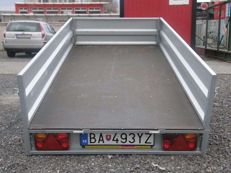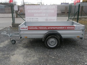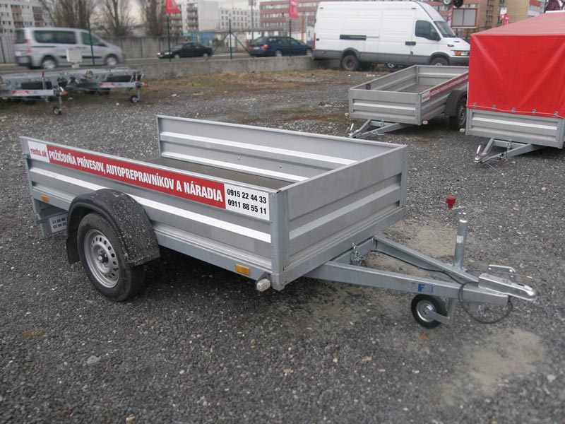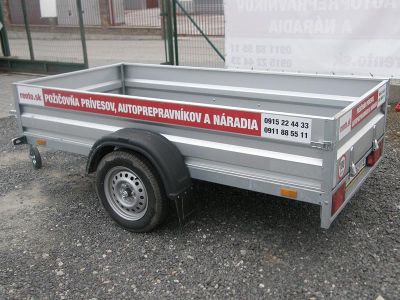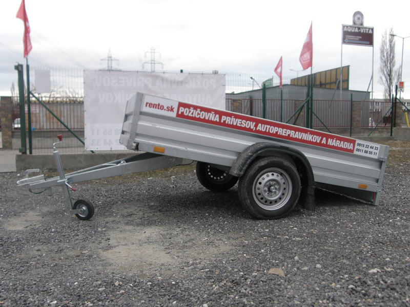 Jednonápravový, nebrzdený prívesný vozík bez colnej plachty, ložná plocha (d/š/v): 2,42 m (dĺžka) x 1,19 m (šírka) x 0,38 m (výška bočníc), zadná bočnica sklápateľná / odnímateľná, najväčšia prípustná celková hmotnosť: 750 kg, užitočná hmotnosť: 575 kg (toľko sa dá odviezť), prevádzková hmotnosť (váha prázdneho vozíka): 125 kg, SK diaľničná známka pre tento vozík je potrebná iba v prípade, ak by ste ako celá súprava presahovali váhu 3,5 tony. Oporné koliesko a popruhy na uchytenie tovaru v cene prenájmu.